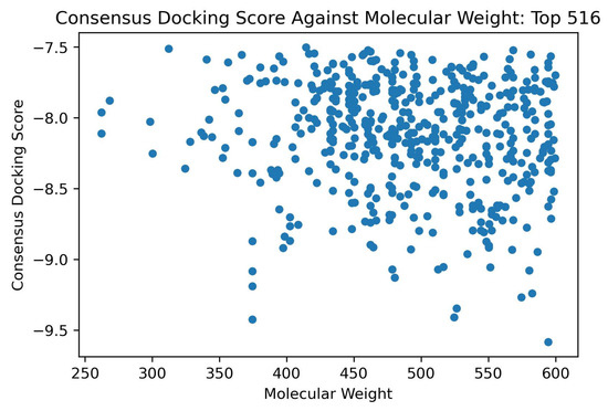 Consensus docking score against the molecular weight plot of the top 516 shortlisted compounds from molecular docking.