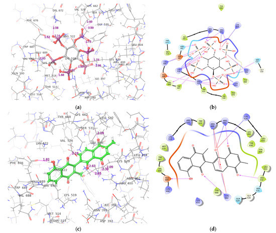 Conformation and protein–ligand interaction profiles of the binding pose with the most negative binding energy of IHP (a,b) and ZINC000044417732 (c,d). For the interaction profiles, purple arrows, red lines and combination of “red and blue” lines represent hydrogen bonds, pi-cation interactions and salt-brides, respectively.