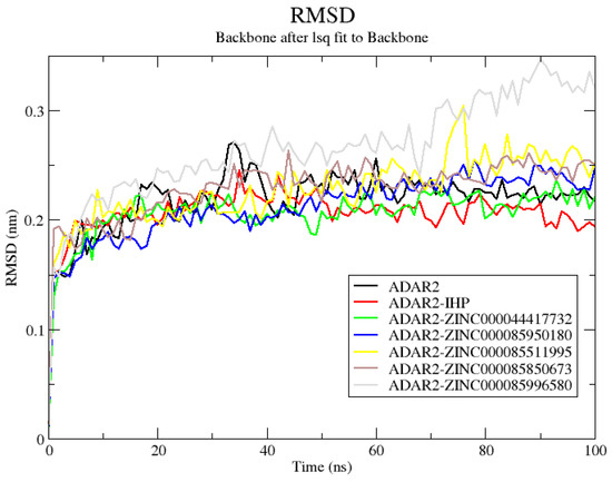The RMSD values between the structures at times 25, 50, 75, and 100 ns when aligned to the initial structure (time = 0 ns) were 1.064, 1.161, 1.074, and 1.231 Å, respectively, for the ADAR2-IHP complex. For the ADAR2-ZINC000044417732 complex, RMSDs of 1.052, 1.264, 1.395, and 1.631 Å, respectively, were observed. For the ADAR2-ZINC000085950180 complex, 1.091, 1.064, 0.945 and 1.050 Å, respectively, were the observed RMSDs. Moreover, the ADAR2-ZINC000085511995 complex had RMSDs of 0.914, 0.932, 1.108, and 1.272 Å, respectively. The ADAR2-ZINC000085850673 structures at 25, 50, 75 and 100 ns also had RMSD values of 0.991, 1.204, 1.196, and 1.189 Å, respectively, when aligned to the initial structure. The ADAR2-ZINC000085734971 complex had RMSD values of 1.082, 1.149, 1.001, and 1.104, Å, respectively. The ADAR2-ZINC000100513617 complex also demonstrated stability with RMSD values of 1.359, 0.988, 0.996 and 1.292 Å, respectively. The relatively low RMSDs demonstrated by these complexes corroborate their good stability observed in the RMSD plots (Figure 5 and Figure S3A).