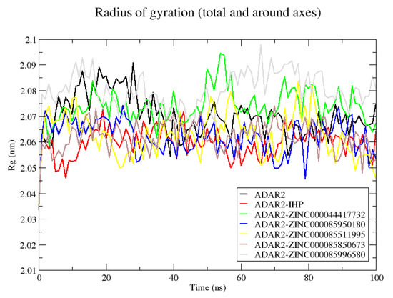 The radius of gyration provides information about the stability, folding and compactness of a protein, and can be further defined as the RMSD of atoms from the centroid of a protein [139,140]. The Rg plots of all the structures (unbound protein and complexes) revealed good stability and compactness of the ADAR2 protein. The Rg values of all the systems ranged between 2.04 nm and 2.1 nm (Figure 6 and Figure S3B), signifying their stable folding [140]. The unbound protein maintained an average Rg of about 2.085 nm till about 27 ns, then fell to 2.055 nm at around 40 ns, then it rose and maintained an average of 2.07 ns until the end of the simulation (Figure 6). The IHP maintained an average Rg of 2.06 nm throughout the simulation (Figure 6). The ADAR2-ZINC000044417732 complex was relatively stable, maintaining an average of 2.075 nm throughout the simulation, although a high rise in Rg (to about 2.095 nm) was observed between 50 and 60 ns (Figure 6). The ADAR2-ZINC000085950180, ADAR2-ZINC000014612330 and ADAR2-ZINC000085850673 complexes demonstrated similar trends (Figure 6 and Figure S3B). All three complexes were very stable throughout the simulation period, maintaining an average of 2.065 nm. The Rg of the ADAR2-ZINC000085734971 complex was also very stable until 80 ns with an average of ~2.05 nm, where a rise to 2.06 nm was observed (Figure S3B).