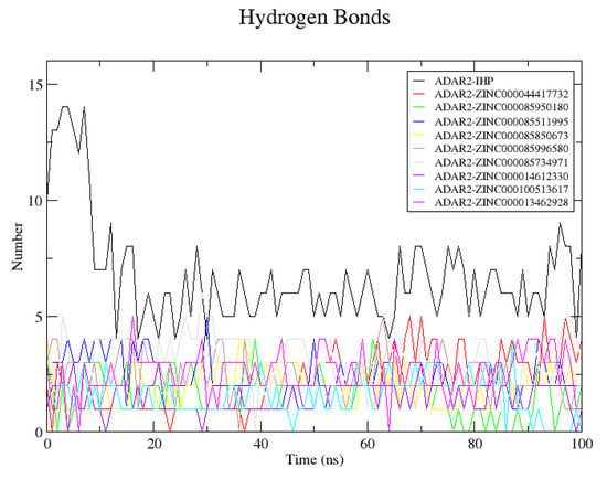 The ADAR2-ZINC000085950180 complex had 3 hydrogen bonds with Ser531, Leu532, and Asp695 initially and 3 hydrogen bonds with Arg401, Tyr408, and Asp695 after the simulation (2 H-bonds were reported via “gmx hbond”). ZINC000085996580 was predicted to form 3 hydrogen bonds with ADAR2 at initial time, although only 1 bond with Ser532 was observed via Maestro. After the 100 ns MD simulation, 2 hydrogen bonds with Arg400 and Gln669 were observed. ZINC000100513617 formed 2 hydrogen bonds with Arg401 before the simulation (although 3 were predicted by “gmx hbond”) which were lost after the simulation. Multiple hydrogen bonds between a protein and a ligand have been shown to improve ligand binding and influence ligand activity [72,73]. However, the hydrogen bonds existing between both the donor and receptor must be either weaker or stronger than that between hydrogen and oxygen atoms in water, in order to influence ligand binding affinity [73]. Apart from ZINC000100513617, all the potential leads maintained hydrogen bonds with the ADAR2 throughout the simulation.