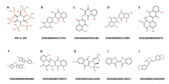 Herein, the MM/PBSA approach was employed to determine the binding free energies as well as the energy contributions per-residue of the ADAR2-ligand complexes. Ligand structures of the top nine potential lead compounds and IHP are presented in Figure 8, while those of the other compounds listed in Table 2 are shown in Figure S4. The other contributing energy terms, including van der Waals (vdW), electrostatic, polar solvation and solvent accessible surface area (SASA) energies were also computed (Table 4). The vdW energy of the complexes ranged between −138 and −177.93 with the ADAR2-IHP having the highest vdW energy (−138.816 kJ/mol) [Table 4]. ZINC000085734971 demonstrated the most negative vdW energy with −177.923 kJ/mol, followed by ZINC000013462928 (−177.25 kJ/mol) and ZINC000085996580 (−174.655 kJ/mol) [Table 4]. For SASA energy, the values ranged from −14.949 to −22.88 kJ/mol with ZINC000085996580 and ZINC000100513617 demonstrating the most and least negative energy values, respectively (Table 4). SASA is linearly related to the non-polar solvation energy [144,146,147]. The SASA term is usually small and has little variations among similar ligands [144].
