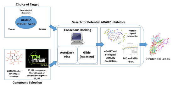 The availability of NMR and X-ray structures of the human ADAR2 (hADAR2) with the dsRNA of GluA2 offer an opportunity for the in silico screening of potential inhibitors of RNA editing [27,28]. This project therefore sought to employ structure-based drug design (SBDD) methods to identify natural products-derived compounds with potential inhibitory activity against the hADAR2 enzyme. SBDD approaches have become beneficial in identifying small molecules for treating various diseases [29] and natural products serve as an extensive reservoir of therapeutic candidates [30]. Natural products are structurally diverse and can be explored for the treatment of various disorders [31,32]. Since antiquity, traditional Chinese medicine has been used to improve neural regeneration and to repair neurological disorders [33,34,35]. Therefore, this study carefully predicted good binders of the ADAR2 with probable inhibitory activity by using structure-based virtual screening, molecular dynamics simulations and molecular mechanics Poisson–Boltzmann surface area calculations using compounds obtained from the Chinese flora and fauna. The study further predicted the biological activity and toxicity profiles of the identified biomolecules.
