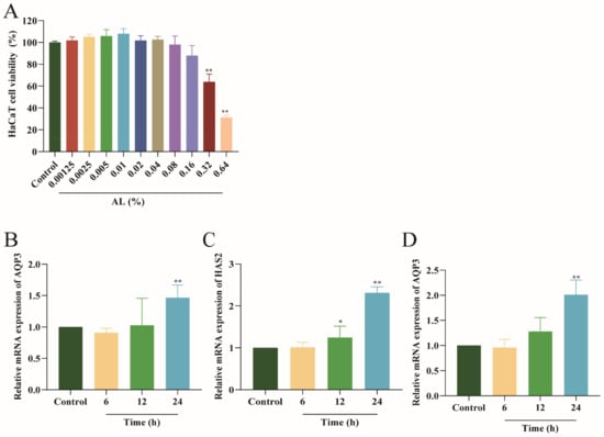Effects of different AL treatment concentrations and times on HaCaT cells. (A) HaCaT cells treated with AL (0.00125~0.64%) for 24 h. The mRNA expression of AQP3 (B), HAS2 (C), and HAS3 (D) in HaCaT cells treated with 0.02% AL for different times. Results are expressed as means ± SDs of three independent experiments. ** p < 0.01, * p < 0.05 compared to the normal group (no treatment). One-way ANOVA was used to evaluate significance.