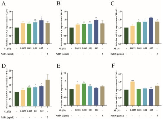 Effect of AL on the mRNA expression of moisturizing-related genes in HaCaT cells. Relative expressions of AQP3 (A), HAS2 (B), HAS3 (C), FLG (D), TJP−1 (E), and TGM−1 (F) were detected in HaCaT cells via RT-qPCR. Results are expressed as means ± SDs of three independent experiments. Relative expression quantity values were calculated relative to the β-actin gene. *** p < 0.001, ** p < 0.01, * p < 0.05 compared to the normal group (no treatment). One-way ANOVA was used to evaluate significance.