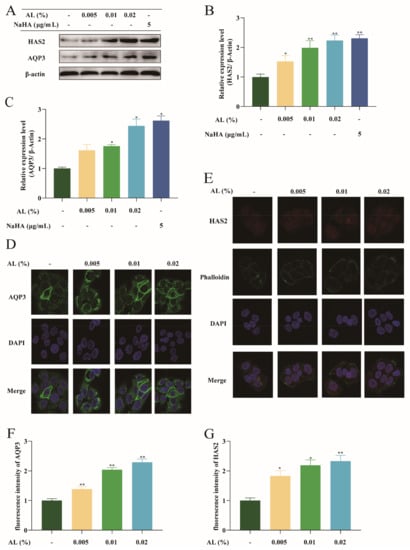 2.3. AL Promoted the Expression of AQP3 and HAS2 in HaCaT Cells