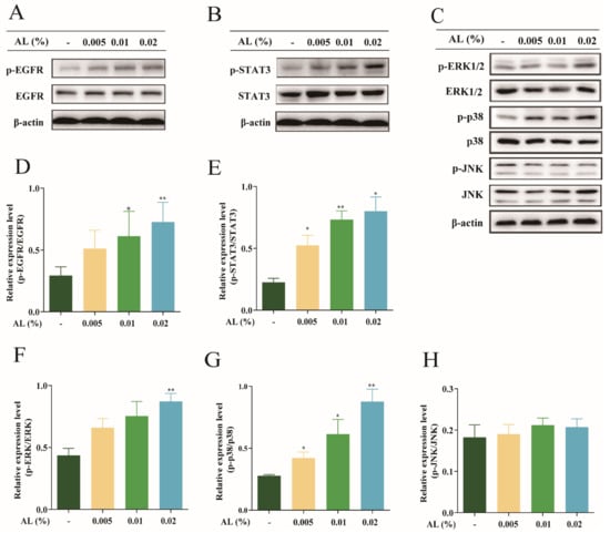 AL exerted skin moisturizing effects by upregulating EGFR signal pathways. Protein bands of EGFR (A), STAT3 (B), ERK, p38, JNK (C) in HaCaT cells; protein quantification analysis of EGFR (D), STAT3 (E), ERK (F), P38 (G), JNK (H). Results are expressed as means ± SDs of three independent experiments. ** p < 0.01, * p < 0.05 compared to the normal group (no treatment). One-way ANOVA was used to evaluate significance.