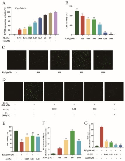 This study was based on an oxidative damage model of HaCaT cells induced by H2O2 to explore the antioxidant effect of AL. The results showed that AL scavenged DPPH radical dose-dependently, and the 50% effective concentration (EC50) value was 7.684% (Figure 5A). The survival of HaCaT cells was reduced after H2O2 treatment (Figure 5B); however, survival was increased via AL for each treatment within 24 h of treatment (Figure 5E). The ROS production of HaCaT cells reached the maximum when the H2O2 induction dose was 800 μM (Figure 5C,F). After treatment with AL and vitamin C (Vc) for 24 h, H2O2-induced ROS production in HaCaT cells was significantly reduced (Figure 5D,G). The results showed that AL could protect HaCaT from oxidative damage caused by H2O2 and inhibit ROS production.