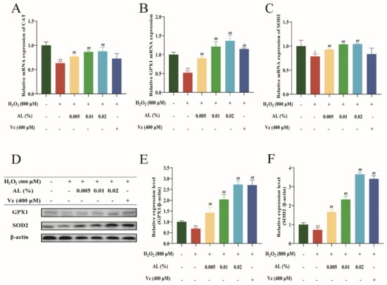 It has been reported that SODs, GPxs, and CATs are pivotal in oxidative stress []. This study found that H2O2 significantly downregulated the mRNA expression of CAT, GPX1, and SOD2 in HaCaT cells (Figure 6A–C); however, expression was increased following pre-treatment with AL and Vc. A Western blotting experiment also revealed that H2O2 could downregulate GPX1 and SOD2 protein expression in HaCaT cells. In contrast, protein expression levels of GPX1 and SOD2 in cells were upregulated or even restored to the normal level after treatment with AL and Vc (Figure 6D–F). The results suggested that AL could play an antioxidant role by stimulating the expression of CAT, GPX1, and SOD2.