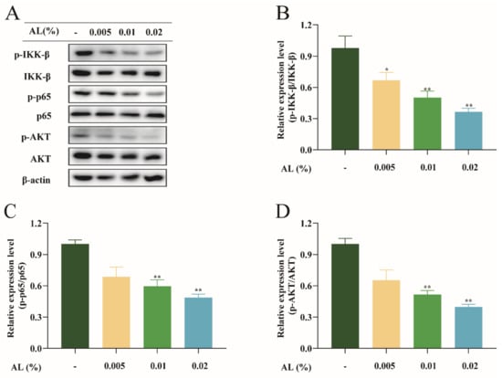 We chose the nuclear factor κB (NF-κB) signaling pathway to examine the specific antioxidant mechanisms of AL. This pathway has been demonstrated to rapidly increase gene expression in inflammatory, immune, and oxidative stress []. AL dose-dependently decreased the expression of phosphorylated IKK-β, p65, and AKT in the NF-κB pathway (Figure 7). The results suggested that inhibition of the NF-κB signaling pathway appears to be the mechanism via which AL exerts its antioxidant action.