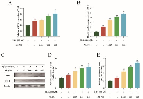 Nrf2 is a crucial component of the oxidative stress defense system []. HO-1 is an important antioxidant enzyme controlled by Nrf2 and controls the amount of ROS inside cells in response to different stressors. Our study (Figure 8A,B) showed that AL could significantly augment the mRNA expression of Nrf2 and HO-1 in a dose-dependent manner. A Western blot experiment revealed that AL significantly increased the protein expression of Nrf2 and HO-1 (Figure 8C–E). The results suggested that AL attenuated H2O2-induced oxidative stress by stimulating the Nrf2/HO-1 signaling pathway.