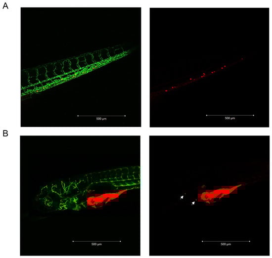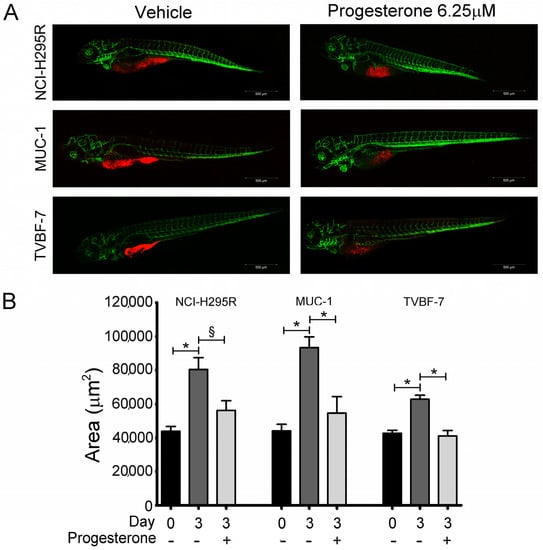 Tumor xenograft experiments were performed as described in [] with minor modifications. Briefly, to evaluate the toxic effect of Pg on the zebrafish model, 48 hpf wildtype embryos (AB) were divided into different groups as indicated and maintained in PTU/fish water, to which solvent (DMSO) or increasing concentrations of Pg (10, 25, 50, and 100 µM) were added. After 3 days (T3), effects of Pg were observed. To evaluate the effect of Pg on tumor growth, Tg (kdrl:EGFP) zebrafish embryos at 48 hpf were dechorionated, anesthetized with 0.042 mg/mL tricaine, and microinjected with the labeled tumor NCI-H295R, MUC-1, and TVBF-7 cells (CellTrackerTM CM-Dil Dye, Thermo Fisher Scientific, Milan, Italy) into the subperidermal space of the yolk sac. Microinjections were performed with a FemtoJet electronic microinjector coupled to an InjectMan N12 manipulator (Eppendorf Italia, Milan, Italy). Approximately 250 cells/4 nL were injected into each embryo (about 25 embryos/group); embryos were maintained in PTU/fish water in a 32 °C incubator to allow tumor cell growth. Pictures of injected embryos were acquired using a Zeiss Axiozoom V13 (Zeiss, Jena, Germany) fluorescence microscope, equipped with Zen 2.3 Blu software, 2 h after cell injection (T0). Then, 6.25 µM Pg, 12.5 µM Pg, or solvent (DMSO)was directly added to the PTU/fish water in Pg-treated and untreated experimental groups. After 3 days (T3), the effects of the drug on cancer growth were scored by taking pictures, as previously described, to measure the tumor areas of each group at T0 and T3 using Zen 2.3 Black software (ZEISS, Jena, Germany). Embryos with metastases (i.e., the presence of at least one fluorescence dot outside the site of injection) were counted, and some representative xenografted embryos were fixed, embedded in low melting agarose, and imaged using an LSM 510 confocal laser microscope equipped with an Achropla 10×/0.25 objective.
