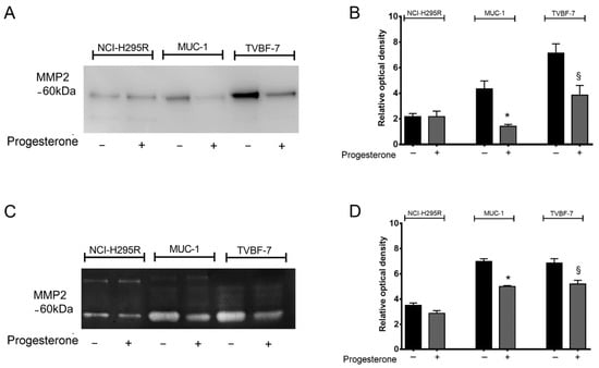 The secretion and the activity of MMP 2 were decreased after Pg treatment. (A) Representative Western blot of MMP2 in the conditioned medium secreted by ACC cells. (C) Representative zymogram of MMP2 in the conditioned medium secreted by ACC cells. (B,D) Quantification of Western blots and zymography. Results are presented as the mean relative optical density ± SEM of three independent experiments. * p < 0.0001, § p < 0.05 vs. untreated cells.