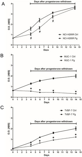 Effect of drug withdrawal on NCI-H295R (A), MUC-1 (B), and TVBF-7 (C) ACC cell lines. Cells were treated for 4 days with respective IC50 values of Pg; then, the drug was withdrawn from the medium, and cells were kept in culture for up to 10 days. The cell viability time course was measured by the MTT assay. Points represent the mean ± SEM of at least three experiments performed in triplicate. * p < 0.0001, # p < 0.001, § p < 0.05 vs. untreated cells.