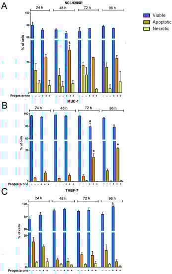 Pg promoted apoptotic cell death in NCI-H295R (A) and MUC-1 (B) cell lines but not in TVBF-7 cells (C). Cells were treated for 24, 48, 72, or 96 h using their Pg IC50 values, stained with Pacific BlueTM annexin V, and analyzed by flow cytometry. Histograms representative of the mean ± SEM of three experiments are shown. * p < 0.0001, # p < 0.001 cells, § p < 0.05 vs. untreated cells.