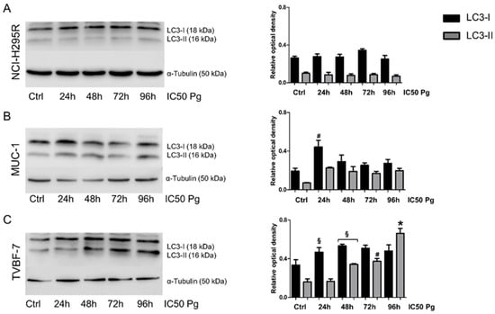 Pg triggered autophagy cell death in TVBF-7 cell lines. Representative Western blot of LC3-I and LC3-II protein levels in NCI-H295R (A), MUC-1 (B), and TVBF-7 (C) are shown. On the right side, quantification results are presented as a relative optical density means ± SEM of three independent experiments. * p < 0.0001, # p < 0.001, § p < 0.05 vs. untreated cells.