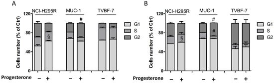 Pg treatment also influences the cell-cycle distribution in NCI-H295R cells []. The cell-cycle distribution in MUC-1 and TVBF-7 ACC cell lines after Pg treatment was studied. Figure 8A,B show that, in NCI-H295R cells, treatment with Pg increased the proportion of cells in the G1 phase after both 72 h and 96 h (72 h: +10.65 ± 4.1%, 96 h: +3.08 ± 0.05%; p < 0.05). An increase in the G2 phase fraction was observed in MUC-1 cells at the same timepoints (72 h: +11.1 ± 0.05%, 96 h: +8.18 ± 1.42%; p < 0.005), along with a decrease in cells in the S phase after 96 h of treatment (−7.2 ± 1.02%; p < 0.005). No changes in the cell-cycle distribution were observed in Pg-treated TVBF-7 cells compared to controls. Representative DNA histograms for each cell line are shown in Supplementary Figure S6.