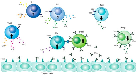 28. Qin, J.; Zhou, J.; Fan, C.; Zhao, N.; Liu, Y.; Wang, S.; Cui, X.; Huang, M.; Guan, H.; Li, Y.; et al. Increased Circulating Th17 but Decreased CD4(+)Foxp3(+) Treg and CD19(+)CD1d(hi)CD5(+) Breg Subsets in New-Onset Graves’ Disease. Biomed. Res. Int. 2017, 2017, 8431838. [Google Scholar] [CrossRef]