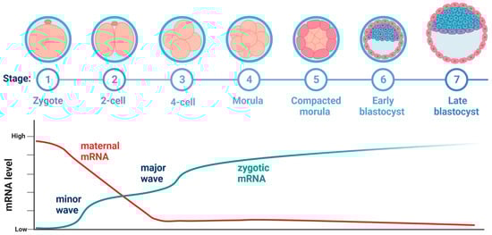 Oocytes contain RNA and proteins, creating a unique landscape that is crucial during early development because that is the only thing it relies on at the first stages of fertilization, meiosis-to-mitosis transition, reprogramming, and the beginning of embryogenesis [34,45]. The maternal to zygotic transition (MZT) is a stage that a large number of investigated species go through, and is a stage that occurs at the beginning of early development [2,46]. After fertilization, the development of the embryo is not directly led by the newly formed zygote, and there is a gradual shift of control from the maternal genome to the zygotic genome [47]. The transition occurs as two activities, the task of which is to differentiate the fertilized oocyte into a totipotent embryo. The first is to dispose of all the maternal machinery that was necessary to prepare the oocyte for fertilization and at the beginning of embryogenesis, and the second is to allow ZGA to occur [47,48,49].