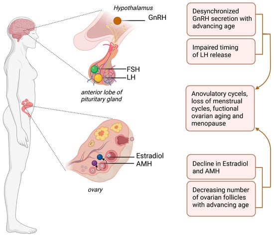 Concentrations of steroid hormones, estradiol and progesterone, determine the potential fertility of women and affect many issues related to their health [53]. The dominant sex steroid hormones in women are estrogens, such as estrone (E1), estradiol (E2), and estriol (E3). Estradiol is the main circulating sex hormone before menopause, while estrone plays an important role after menopause [54]. The direct substrates for the synthesis of estrogens are testosterone and androstenedione [55]. Here, SNARE proteins (soluble NSF attachment receptor) are involved in the transport of cholesterol from lipid cells. Cholesterol is then converted to pregnenolone for further production of dehydroepiandrosterone (DHEA), which is an androgen precursor [56]. The site of estrogen synthesis in non-pregnant women is mainly the ovary, while in pregnant women it is the placenta [54]. Estrogens, among others, play a crucial role during the regulation of the menstrual cycle [57]. In addition, these hormones affect calcium and lipid metabolism and affect protein synthesis [58]. The level of circulating estradiol and anti-müllerian-hormone (AMH) is affected by the reproductive status of women. The AMH level especially decrease with advancing age and with an advancing decrease of remaining follicles, mirroring, therefore, the ovarian reserve (Figure 2) [54]. When discussing the hormonal regulation of the female reproductive cycle, the hypothalamic–pituitary–ovarian axis should also be mentioned. An important hormone of this axis is gonadotropin releasing hormone (GnRH), which is a hypothalamic hormone stimulating the anterior lobe of the pituitary gland to release follicle-stimulating hormone (FSH) and luteinizing hormone (LH) [59]. FSH is responsible for the development of ovarian follicles, one of which becomes the dominant follicle and releases an egg during the ovulation phase. The ovulatory follicle secretes estradiol [60]. FSH is also responsible for the activity of aromatase in granulosa cells involved in the synthesis of estrogens, as well as for the formation of LH receptors on the membrane of these cells and in the corpus luteum [61]. The maximum surge of LH causes ovulation, in the place of which, after ovulation, the corpus luteum is formed, which produces progesterone [62].