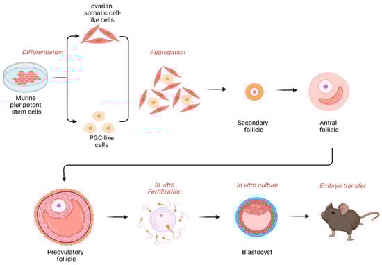 Scheme showing the in vitro production of functional oocytes from pluripotent stem cells in the murine animal model.