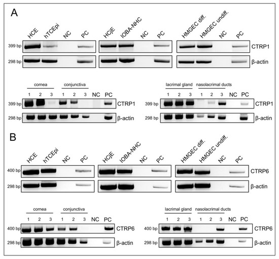 CTRP1 and CTRP6 gene expression in human tissues and cell lines by RT-PCR. (A) Gene expression of CTRP1. (B) Gene expression of CTRP6. The gene expression is shown by the black bands. Expression of β-actin confirms the presence of tested cDNA. Human corneal epithelial cells (HCE), telomerase-immortalized human corneal epithelial cells (hTCEpi), human conjunctival epithelial cells (HCjE), IOBA-normal human conjunctiva (IOBA-NHC), human meibomian gland epithelial cells (HMGEC; differentiated and undifferentiated). Positive control (PC) is liver for CTRP1 and placenta for CTRP6. Negative control (NC) contains no template cDNA. Pictures are representative for at least three individual experiments for each tissue and cell line.