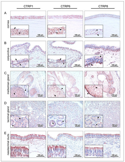 Immunohistochemical detection of CTRP1, CTRP6, and CTRP8 in tissues of the human lacrimal apparatus and ocular surface. The antibody reaction can be seen by the intracellular red reactivity. Pictures shown are representative for human cornea (A), conjunctiva (B), meibomian gland of upper eye lid (C), lacrimal glands (D), and nasolacrimal ducts (E). Inlays show higher magnification. Nuclei are counterstained with hemalum (blue). Arrows and arrowheads accentuate the reactivity localization. For each tissue, at least three individual sections were stained.
