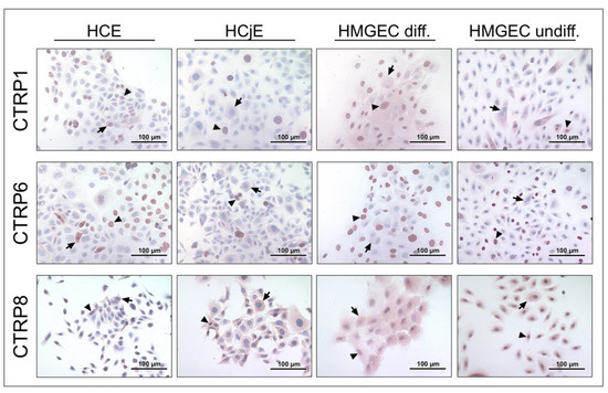 Immunohistochemical detection of CTRP1, CTRP6, and CTRP8 in cell lines of the human lacrimal apparatus and ocular surface. The antibody reaction can be seen by the intracellular red reactivity. Pictures shown are representative for human corneal epithelial cells (HCE), human conjunctival epithelial cells (HCjE), differentiated human meibomian gland epithelial cells (HMGEC), and undifferentiated HMGEC. Nuclei are counterstained with hemalum (blue). Arrows and arrowheads accentuate the reactivity localization. For each cell line, three individual experiments were performed.