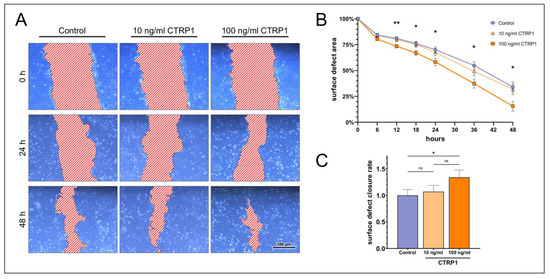 Scratch assays show the dose-dependent impact of CTRP1 on surface defect closure in human corneal epithelial cells (HCE). (A) After performing the initial scratch, HCE cells were stimulated with 0, 10, or 100 ng/mL recombinant human CTRP1 for 48 h. The surface defect was measured in a representative segment of a scratch (n = 9) at different time points and compared to untreated cells (control). (B) Relative surface defect area ± SEM over time. The graph shows a significant decrease in the relative surface defect area in cells treated with 100 ng/mL CTRP1 compared to the control (two-way ANOVA; * p < 0.05; ** p < 0.01). Treatment with 10 ng/mL CTRP1 had no significant effect on the surface defect area when compared to the control (two-way ANOVA; p > 0.05). (C) Fold-increase in the surface defect closure rate. Bars represent mean ± SEM. 100 ng/mL CTRP1 increased the relative surface defect closure rate significantly compared to the control (one-way ANOVA; * p < 0.05), while 10 ng/mL CTRP1 was ineffective (one-way ANOVA; ns = not significant, p > 0.05). The difference in the surface defect closure rate between HCE cells treated with 10 ng/mL and 100 ng/mL CTRP1 was not significant (one-way ANOVA; ns = not significant, p > 0.05).