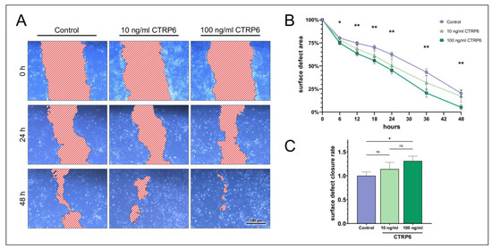 Scratch assays show the dose-dependent impact of CTRP6 on surface defect closure in human corneal epithelial cells (HCE). (A) After performing the initial scratch, HCE cells were stimulated with 0, 10, or 100 ng/mL recombinant human CTRP6 for 48 h. The surface defect was measured in a representative segment of a scratch (n = 9) at different time points and compared to untreated cells (control). (B) Relative surface defect area ± SEM over time. The graph shows a significant decrease in the relative surface defect area in cells treated with 100 ng/mL CTRP6 compared to the control (two-way ANOVA; * p < 0.05; ** p < 0.01). Treatment with 10 ng/mL CTRP6 had no significant effect on the surface defect area when compared to the control (two-way ANOVA; p > 0.05). (C) Fold-increase in the surface defect closure rate. Bars represent mean ± SEM. 100 ng/mL CTRP6 increased the relative surface defect closure rate significantly compared to the control (one-way ANOVA; * p < 0.05), while 10 ng/mL CTRP6 was ineffective (one-way ANOVA; ns = not significant, p > 0.05). The difference in the surface defect closure rate between HCE cells treated with 10 ng/mL and 100 ng/mL CTRP6 was not significant (one-way ANOVA; ns = not significant, p > 0.05).