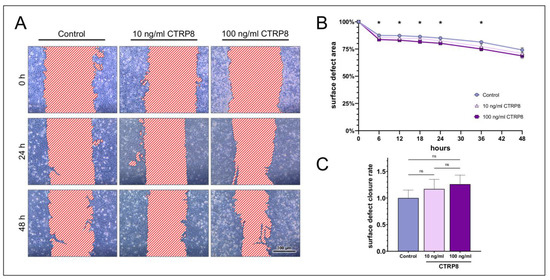 The stimulation of HCE cells with 100 ng/mL CTRP8 also led to a significantly decreased remaining surface defect area at 6, 12, 24, and 36 h of stimulation but lost significance at 48 h (Figure 6). On the other hand, stimulation with 10 ng/mL CTRP8 did not show a significant effect on the surface defect area compared to the control at any time point of observation (Supplementary Table S3). Treatment with CTRP8 did not significantly affect the surface defect closure rate in HCE cells. However, we observed a positive trend in the surface defect closure rate in cells stimulated with 100 ng/mL of CTRP8 (1.26 ± 0.17-fold; p = 0.23).