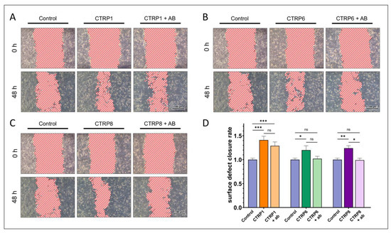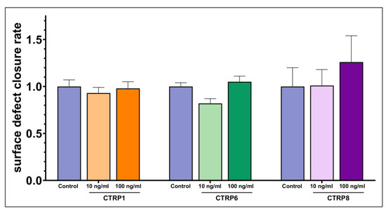 HCjE cells showed no significant increase in the surface defect closure rate when stimulated with 10 or 100 ng/mL of CTRP1, CTRP6 or CTRP8 when compared to the control (Figure 7).