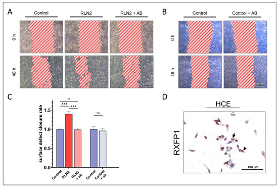 Scratch assays confirm inhibition of RXFP1. (A,B) show representative scratch assays in human corneal epithelial cells (HCE). Epithelial wound closure in cells stimulated with 100 ng/mL Relaxin-2 (RLN2, positive control) (A) or untreated cells (negative control) (B) was observed, respectively, with or without the presence of 3 mg/mL of a specific inhibitory anti-RXFP1 antibody (ab). The surface defect was measured in a representative segment of a scratch (n = 9) at different time points and compared to untreated HCE cells (control). (C) Fold-increase in the surface defect closure rate. Bars represent mean ± SEM. RLN2 significantly increased the surface defect closure rate compared to the untreated control (one-way ANOVA; *** p < 0.001). The presence of the inhibitory anti-RXFP1 antibody significantly reduced the effect of RLN2 on the surface defect closure rate (one-way ANOVA; *** p < 0.001). There were no significant differences in the surface defect closure rate between the untreated control and HCE that were treated with RLN2 but also underwent RXFP1 inhibition (one-way ANOVA; ns = not significant, p > 0.05). The antibody alone did not significantly alter the surface defect closure rate (unpaired t-test; ns = not significant, p > 0.05). (D) RXFP1 protein expression was confirmed prior to scratch assays in HCE cells via immunohistochemistry. The antibody reaction can be seen by the red reactivity. Nuclei are counterstained with hemalum (blue). Arrows and arrowheads accentuate the reactivity localization. Three individual experiments were performed.