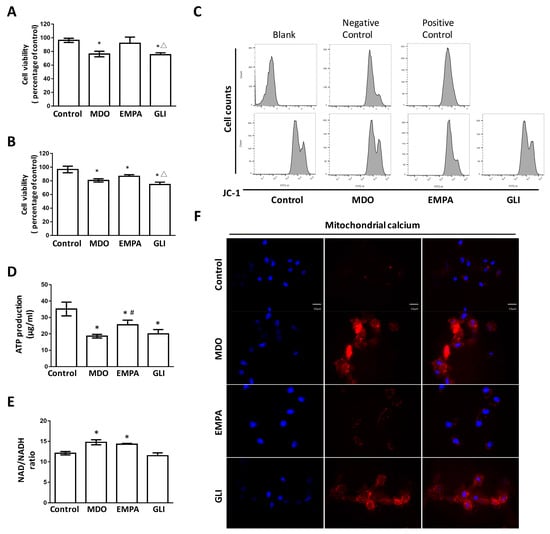 Effects of the pericardial fat secretome of different groups of metabolic-syndrome-associated mice on cardiomyocyte H9c2. Secretome of pericardial fat on H9c2 cell viability inhibition at (A) 48 h and (B) 72 h. (C) The effect of secretome on mitochondrial membrane potential alteration of H9c2. 50 ug/mL CCCP was used as positive control. (D) ATP production capacity and (E) NAD+/NADH ratio were determined as the evaluation of H9c2 mitochondrial function after treatment with different groups’ pericardial fat secretome. (F) Rhod-2 AM staining for intra-mitochondria Ca2+ distribution (Magnification: 400×). In vitro study, n = 3 for each group, * p < 0.05 compared with control group, # p < 0.05 compared with MDO group, Δ p < 0.05 compared with EMPA group.