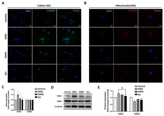 We further investigated the mitochondrial dysregulation induced by secretomes from epicardial fat. Since mitochondrial dysfunction is highly associated with ROS production, the expression of intracellular ROS among the study groups was investigated. As shown in Figure 2A, CellROX-staining to investigate the intracellular ROS distribution revealed that ROS in H9c2 cells accumulated in the cytoplasm after MDO secretome treatment. The MDO secretome-induced production and accumulation of ROS in mitochondria was also investigated. Figure 2B shows that mitochondrial ROS levels also increased significantly after MDO secretome treatment, indicating that the MDO secretome increased ROS in both whole H9c2 cells and mitochondria. Co-treatment with the EMPA secretome effectively reduced accumulation of intracellular and intramitochondrial ROS, suggesting that SGLT2i reduced the intracellular OS caused by MDO fat and improved cardiomyocyte survival. We then examined the gene and protein expression of the OS-related regulatory factors, SOD1 and SOD2 (Figure 2C–E). The gene expression and protein expression of SOD1 in the MDO group increased significantly by 1.5-fold and 1.34-fold, respectively. However, compared with the control group, neither the gene nor the protein of SOD1 increased significantly in the EMPA group. There was no significant change in SOD2 regardless of group. These results indicated that the MDO secretome increased ROS production and the expression of SOD1 under OS, but these effects were attenuated by the EMPA and GLI secretomes.