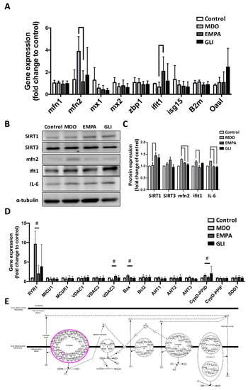 ROS production and mitochondrial dysfunction in cardiomyocytes were attenuated in the EMPA group compared with the MDO group. In addition, several markers associated with mitophagy and mitochondrial biogenesis were significantly expressed in the EMPA group. Mitochondrial fusion, biogenesis, and mitophagy are associated not only with energy production but also with cardiovascular diseases, including heart failure []. The ifit family is associated with cellular interferon. In addition to the cellular immune response, they participate in apoptosis [,]. The increase in ifit-1 in the MDO group indicates the progression of apoptosis associated with OS, which has an impact on cardiomyocyte viability and could result in heart failure. In contrast, the secretome from the EMPA group might have reduced the cardiomyocyte apoptosis caused by the MDO stress response. In addition, the secretome from the EMPA group attenuated mitochondrial dysfunction in cardiomyocytes, as indicated by its effects on factors including SIRT1 expression and ATP production, compared with the dysfunction in the MDO group. SIRT1 is activated when mitochondria experience an energy deficiency or injury. SIRT1 expression increases sirtuin and PGC-1α expression, which might reduce OS and enhance mitochondrial biogenesis. This could preserve the quality and maintenance of mitochondria and improve the viability of cardiomyocytes. However, more evidence and investigation are needed to confirm this mechanism.
