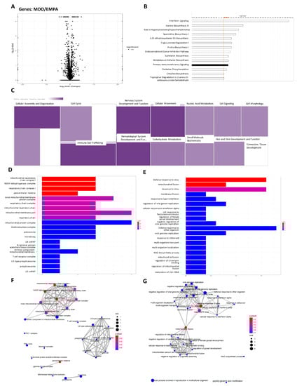 RNA-sequencing analysis of the impact of epicardial fat secretomes on H9c2 cellular process. (A) Volcano pots of differentially expressed genes (DEGs). (B) Canonical Pathway View and (C) Disease & Functions comparative analysis of DEGs’ participation. The analysis of DEGs in (D) cellular component (CC) and (E) biological process (BP) involved in cellular process were revealed. The gene regulatory network of (F) CC and (G) BP were shown by emap plot. (In vitro study, n = 3 for each group).