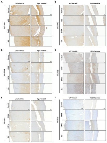 Although we demonstrated the protective effects of the EMPA-related secretome in H9c2 cells, the corresponding biomarkers in mouse ventricular tissue needed to be evaluated for confirmation. Immunohistological analysis was used to evaluate the modifications of SOD1 and SOD2 in the ventricular tissues of mice. The results showed that the protein expression of SOD1 in the left ventricle was increased in the MDO group and was significantly reduced in the EMPA group compared with the control group. The expression in the GLI group was similar to that in the MDO group. In contrast, no significant change in SOD2 was found in either the MDO group or the EMPA group (Figure 5A,B). Regarding proteins that regulate mitochondrial homeostasis, the expression of ifit-1 and mfn2 was significantly increased in the MDO group but dramatically decreased in the EMPA group. However, there were no significant changes to the ifit-1 and mfn2 levels in the GLI group (Figure 5C,D). Furthermore, the modifying effects of the MDO and EMPA secretomes on the SIRT family proteins, SIRT1 and SIRT3, in myocardial ventricular tissue were determined. We found only a mild increase in SIRT1 expression in the MDO group. However, SIRT1 expression was significantly increased in the left ventricular tissue in the EMPA and GLI groups. Interestingly, SIRT3 expression was also slightly increased in the EMPA group, but not significantly (Figure 5E,F). This evidence suggests that the EMPA secretome might benefit myocardial ventricular tissue in part by enhancing mitochondrial function and reducing cell/mitochondrial OS.