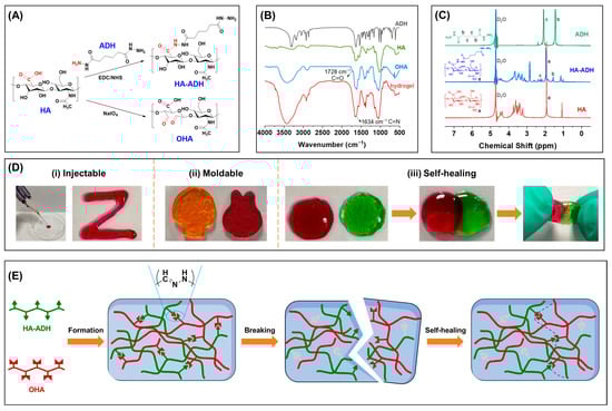 HA-ADH was synthesized via the covalent cross-linking of aldehyde groups in oxidized HA (OHA) and hydrazide groups in adipic dihydrazide (ADH)-modified HA (HA-ADH) with the formation of reversible acylhydrazone bonds [45]. (Figure 1A). Briefly, HA (1 g, 2% w/v) was dispersed in 50 mL of MES buffer (pH value was around 5.4), and then, 7.5 mmol EDC and 7.5 mmol NHS were added and stirred for 1 h and 3 h, respectively, to activate the HA carboxylate groups. Afterwards, 5 mmol ADH was added and stirred for 24 h at room temperature. Finally, the reaction solution was dialyzed (MWCO = 3500) against NaCl (5 g/L) for 1 day and placed in deionized water for another 2 days, and then lyophilized. The product was characterized by 1H nuclear magnetic resonance (1H NMR) in D2O (Avanc III 600 MHz, BRUKER, Karlsruhe, German). OHA was synthesized by an oxidation reaction of HA using sodium periodate according to the previous method with some modifications [46]. (Figure 1A). Briefly, HA (1 g, 1% w/v) was dissolved in 100 mL of distilled water, and 5 mL of NaIO4 (0.5 M) was added dropwise to the HA solution; then, the reaction solution was stirred for 12 h in the dark at room temperature. Thereafter, excess amounts of ethylene glycol were added to terminate the oxidation process. Finally, the reaction mixture was dialyzed (MWCO = 3500) against deionized water for 3 days and then lyophilized. The product was characterized by Fourier transform infrared spectroscopy (FT-IR, VERTEX 70v, Bruker, German).