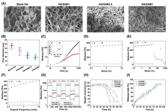 The microstructures of hydrogels were observed by SEM (Figure 2A). Firstly, the internal morphologies of all the hydrogels displayed porous microstructures. Besides that, the blank HA hydrogel showed a larger pore size than all HA/SAB hydrogels. Additionally, the quantified data of pore size is summarized in Figure 2B, and there was found to be a negative correlation between the pore size and the SAB concentration loaded in HA/SAB hydrogels. The quantified values of the pore size of blank HA, HA/SAB1, HA/SAB2.5, and HA/SAB5 were (45.87 ± 3.93 μm), (33.70 ± 6.04 μm), (22.75 ± 4.21 μm), and (18.24 ± 3.04 μm), respectively.