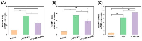 The inflammatory regulation activities of SAB were studied by RT-qPCR. After treatment with LPS and IFN-γ, the mRNA expression level of the pro-inflammatory cytokines IL-1β and ccr7 increased significantly in contrast to the control group, while the overexpression of IL-1β and ccr7 was suppressed significantly by treatment with SAB (Figure 4A,B). On the other hand, IL-4 treatment significantly increased the expression of the M2 marker CD206, indicating the successful stimulation of the M2 phenotype. Additionally, the CD206 expression was elevated further by SAB, suggesting the role of SAB in promoting M2 polarization.