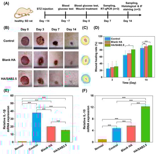 (A) Schematic of the establishment, treatment, and assessment of diabetic wound model. (B) Representative photographs of diabetic wounds on day 0, 3, 7, and 14 for control, blank HA, and salvianolic acid B (SAB)-loaded HA hydrogel (HA/SAB2.5). (C) Schematic diagram of the wound healed by different treatments during 14 days. (D) Quantitative data of wound healing rate on day 3, 7, and 14 following treatment of blank HA hydrogel and HA/SAB2.5 hydrogel, n = 6. (E,F) The mRNA expression level of IL-1β and IL-10 in wound sites on day 7 following treatment of blank HA hydrogel and HA/SAB2.5 hydrogel, n = 3. Data represent mean ± SD; * p < 0.05; ** p < 0.01; *** p < 0.001.