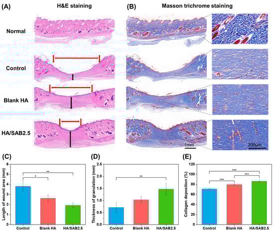 To further analyze the therapeutic effects at the histological level, H&E and Masson trichrome staining were conducted on the regenerated skin tissues collected on day 14. The H&E staining images are shown in Figure 6A, and the quantified data of the remaining dermal space length and thickness of granulation are presented in Figure 6C,D. The results showed that the remaining dermal space lengths of wounds in the control group were the longest (3.81 ± 0.51 mm), while they were shorter in the blank HA hydrogel group (2.62 ± 0.36 mm), and the HA/SAB2.5-treated group had the shortest remaining dermal space length (1.92 ± 0.4 mm). In addition, the regenerated granulation tissue of the blank HA group showed a medium thickness (1.02 ± 0.14 mm) and the HA/SAB2.5 group showed the highest thickness (1.47 ± 0.23 mm) (Figure 6A,D). The Masson trichrome staining results (Figure 6B,E) suggested a similar tendency compared to H&E staining, showing that the HA/SAB2.5 hydrogel-treated group had the most collagen deposition.