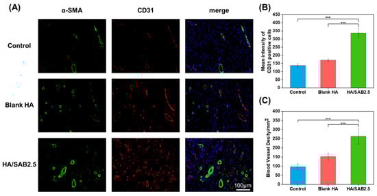 The angiogenesis-promoting abilities of the hydrogels was evaluated by immunofluorescence staining. As shown in Figure 7A, neovascularization occurred in all groups, characterized by the visualization of CD31-positive cells (red) surrounded by α-SMA-positive cells (green). The quantified data of the mean intensity of CD31-positive cells and quantified blood vessel density in wounds are shown in Figure 7B,C. The HA/SAB2.5 group exerted the highest expression of CD31 and α-SMA compared to the blank HA and control groups, demonstrating superior angiogenesis-promoting abilities.