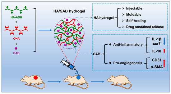 In summary, we successfully developed a multifunctional hydrogel with good injectable and biodegradable properties, a sustainable release capacity of SAB, appropriate mechanical properties, and excellent self-healing properties. In vitro cell experiments showed that the HA/SAB hydrogels could promote cell proliferation and exhibit excellent cytocompatibility. In addition, SAB reduced the pro-inflammatory cytokine (IL-1β and ccr7) production in THP-1-derived macrophages in a high glucose environment, indicating the anti-inflammatory potential in a diabetic wound environment. Furthermore, wounds treated with the HA/SAB2.5 hydrogel showed a faster wound healing rate, reduced inflammatory response, shorter remaining dermal space length, thicker granulation tissue formation, more collagen deposition, and enhanced vascularization, in contrast to the blank HA hydrogel and control groups. Overall, our results demonstrate that the fabricated HA/SAB self-healing hydrogel is promising as a wound dressing to accelerate diabetic wound healing through the promotion of anti-inflammation and angiogenesis (Figure 8).