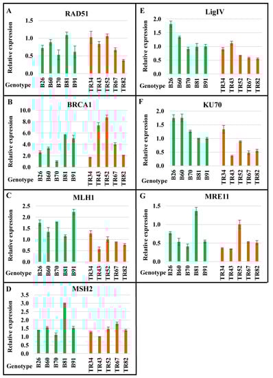 In the Basalt microsite, a comparison of the expression of RAD51, BRCA1, MRE11, and MSH2 between five plants (Figure 1) reveals the lowest level of expression in genotype B70; the highest level in genotype B81; and intermediate levels between B70 and B81 in relative values of gene expression among genotypes B26, B60, and B91. The patterns of LigIV and KU70 expression are rather similar between plants of the Basalt microsite. In the Terra Rossa microsite, there is a similarity between KU70 and MLH1 relative expression patterns, where the highest and lowest expressions are found in genotypes TR34 and TR43, respectively. In genotypes TR52, TR67, and TR82, the expression values gradually decrease. The expression patterns of other genes vary significantly within the Terra Rossa microsite. Therefore, our data show that the intrapopulation variability in the expression levels of genes involved in the HR, NHEJ, MMR, and DDR pathways occurs in a genotype-dependent manner; moreover, they reveal differences between the moist Basalt and dry Terra Rossa microsites in terms of mean gene expression values.