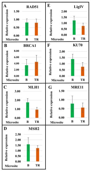 Consequently, the average level of expression of the genes involved in the DDR (MRE11), NHEJ (LigIV and KU70), and MMR (MLH1 and MSH2) pathways in plants of the dry Terra Rossa microsite is lower than that in plants of the humid Basalt microsite. However, the average expression level of RAD51 is almost the same in both microsites, and the average expression level of BRCA1 is higher in the Terra Rossa microsite (Figure 2).