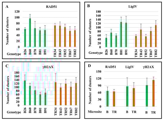 For example, 2.7-fold differences in the number of RAD51 clusters were discovered between cells in genotype B70, 2.2-fold differences in the number of LigIV clusters were documented in the B26 genotype, and 2.6-fold differences were revealed in the number of γH2AX clusters between single cells in genotype TR34 (Table S1). Between genotypes, the biggest differences in the mean numbers of foci per metaphase plate were revealed for LigIV. The smallest number of clusters of LigIV per diploid chromosome plate was found in genotype B26, at 47, and the largest number of clusters was documented in genotype B81, at 127 (Table 1). Variability from 54 to 97 clusters was obtained for RAD51 between plants TR67 and B60, respectively (Table 1). Differences of 2.2 times were found between genotypes B81 and B26, which carry a minimum of 61 and a maximum of 137 γH2AX clusters, respectively (Table 1).