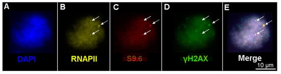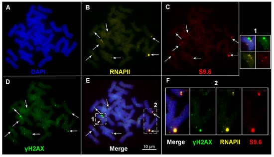 Our data evidence that R-loop formation on condensed chromosomes in the M-phase (Figure 5) is another potential source of chromosomal aberrations and genome instability. Generation of R-loops at transcriptionally active sites is a naturally occurring process in eukaryotic cells, including plants [14,15,17,57]. R-loops play an important role in gene expression, replication, and chromatin structure, whereas accumulation of aberrant R-loops causes DNA damage, particularly DSBs; in turn, DNA damage can initiate R-loop formation [14,58,59]. Adjacent S9.6 and RNAPII foci are co-localized with γH2AX clusters and are also detected as single foci on wheat chromosomes (Figure 5). It can be assumed that both scenarios are realized in the M-phase in the wheat genome. In other words, unresolved DSBs can initiate R-loop formation, while R-loops can induce DSBs at the end of mitosis.