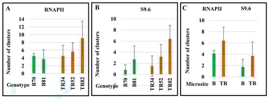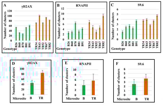The average number of RNAPII and S9.6 clusters in the nuclei varied between plants. The greatest number of clusters, both in nuclei and chromosomes, was documented in genotype TR82 (Table 1 and Table 2). On average, the number of γH2AX, RNAPII, and S9.9 clusters in Terra Rossa plants exceeded that in plants at the Basalt microsite (Figure 8, Table 2).